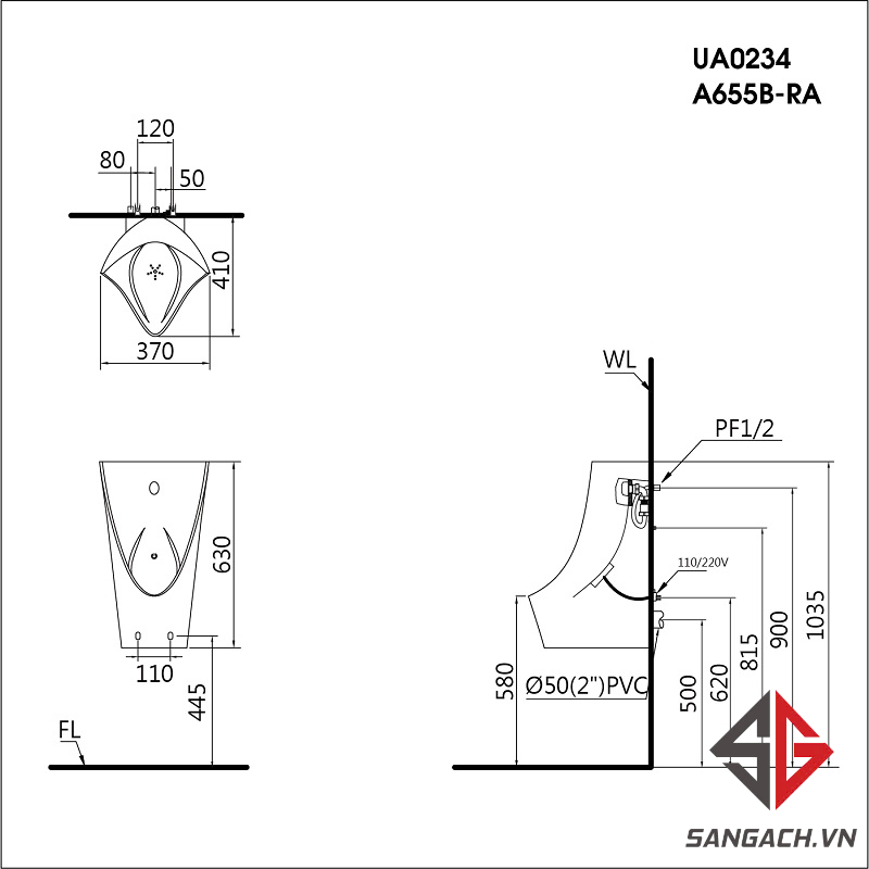 Bản vẽ kỹ thuật bồn tiểu Caesar U0234: