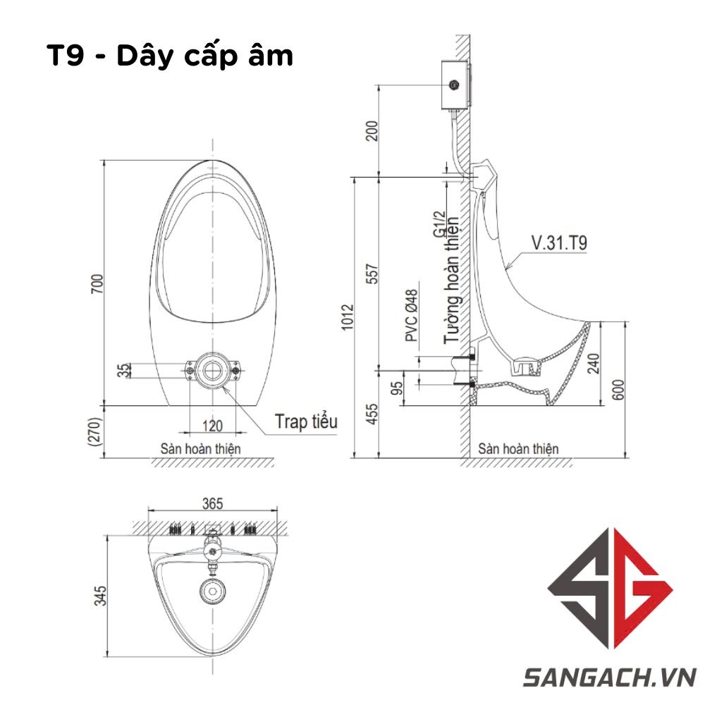 Bản vẽ kích thước bồn tiểu nam T9 Viglacera Cấp Âm: