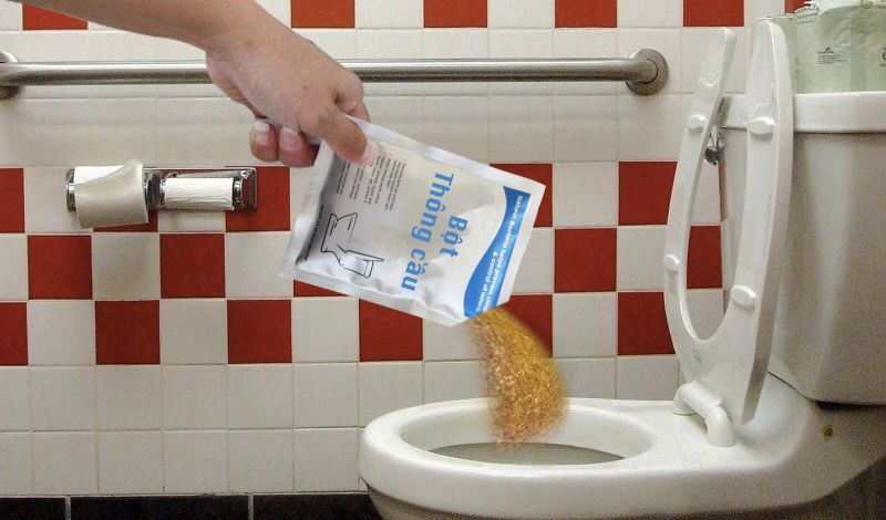 Nếu gia đình bạn luôn có sẵn bột thông bồn cầu thì có thể sử dụng chúng một cách đơn giản hơn. Bạn chỉ cần bỏ bột thông bồn cầu vào trong miệng của bồn cầu. Sau đó giật nước xả để cho bột thông đi theo nước vào sâu bên trong đường ống.