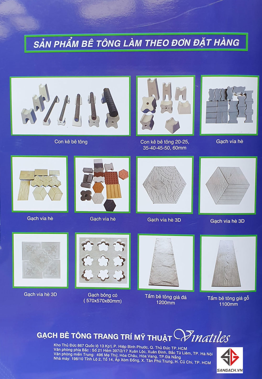 Cũng tương tự như các loại vật liệu khác, gạch bê tông Vinatiles, đặc biệt là gạch thông gió Vinatiles ngày càng đa dạng hơn về mẫu mã và chất lượng, đáp ứng nhu cầu thị hiếu ngày càng tăng của thị trường. Mỗi loại gạch bê tông đều mang một màu sắc, kích thước khác nhau, nó trải qua quá trình ép tỉnh bởi những công nhân lành nghề nên duy trì được độ bền, phù hợp với nhiều mục đích như trang trí, thông gió…