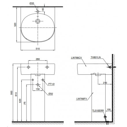 Bản vẽ kỹ thuật chậu rửa TOTO LPT766C treo tường