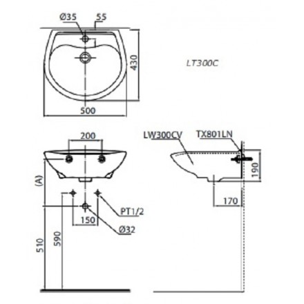 Bản vẽ kỹ thuật chậu rửa TOTO LT300C treo tường