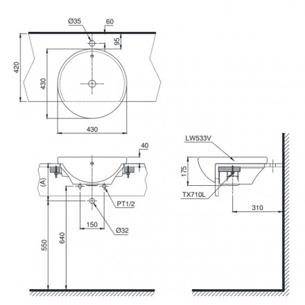 Bản vẽ kỹ thuật chậu rửa TOTO LT533R bán âm bàn