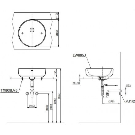 Bản vẽ kỹ thuật chậu rửa TOTO LW895JW/F đặt bàn