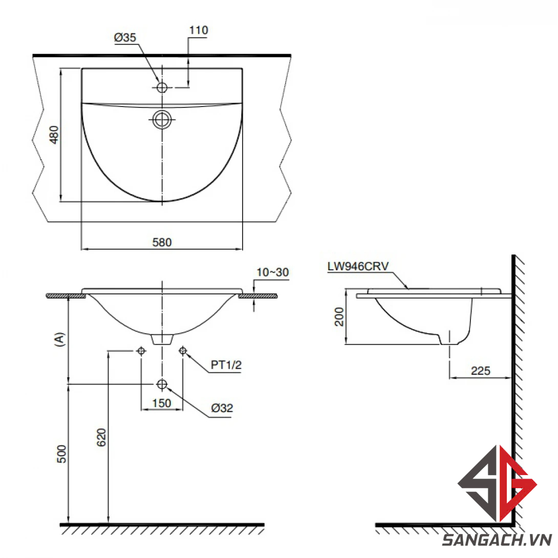 Bản vẽ kỹ thuật chậu rửa TOTO L946CR dương vành
