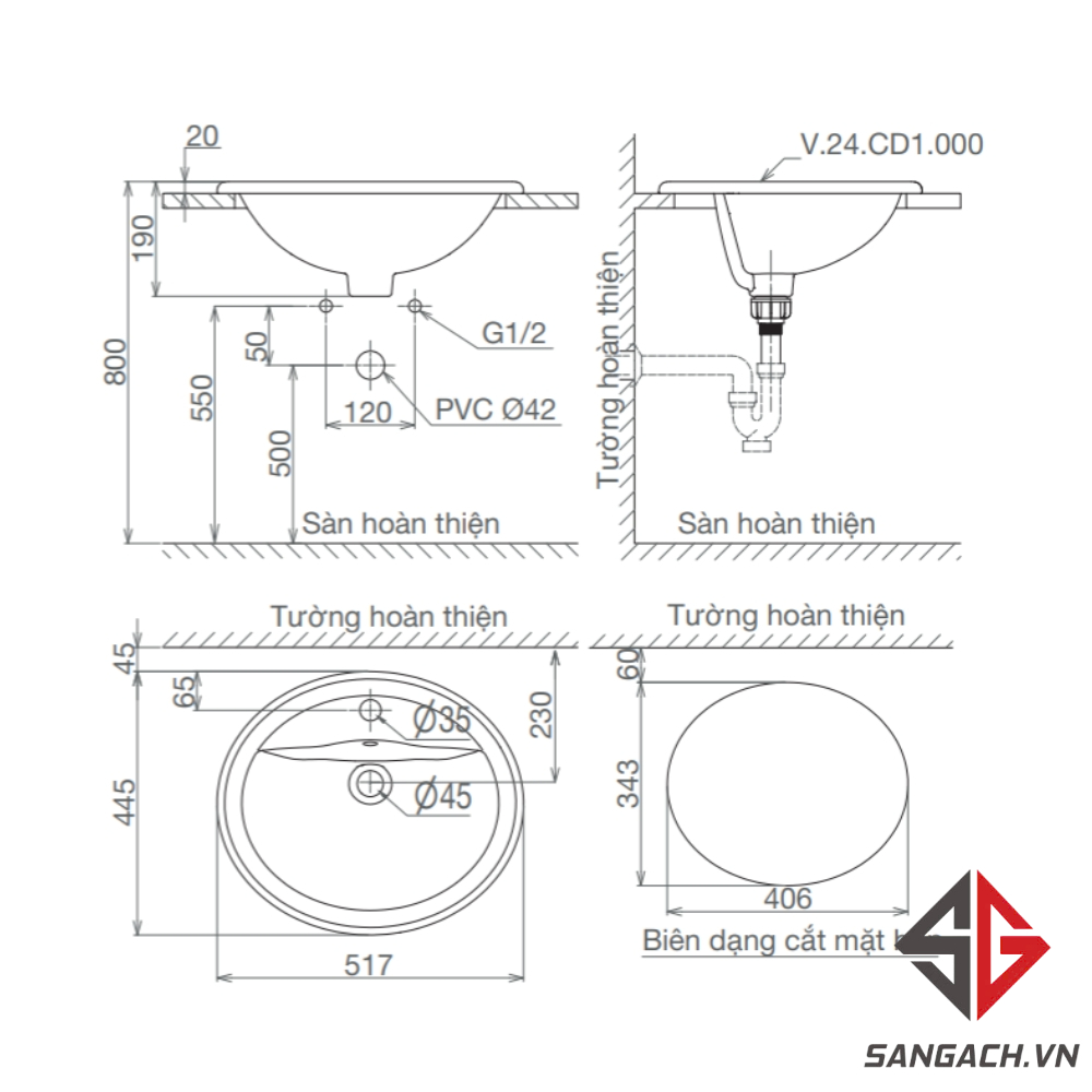 Bản vẽ và hướng dẫn sử dụng của Chậu Rửa Lavabo Viglacera CD1 Âm Bàn Dương Vành: