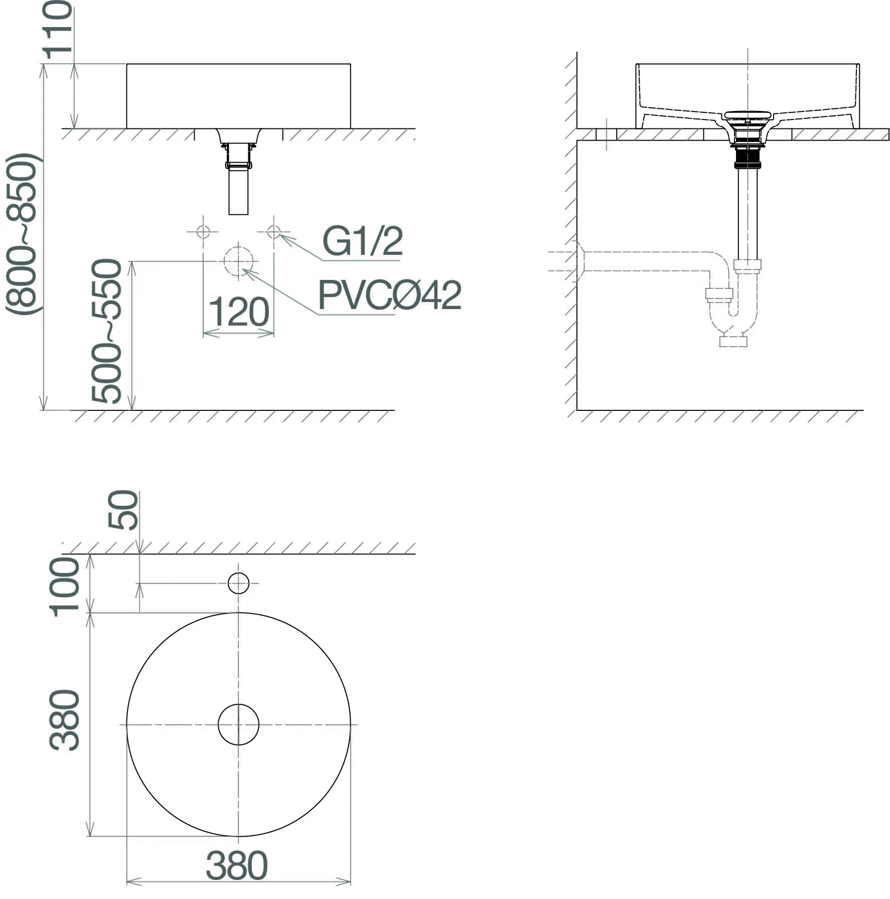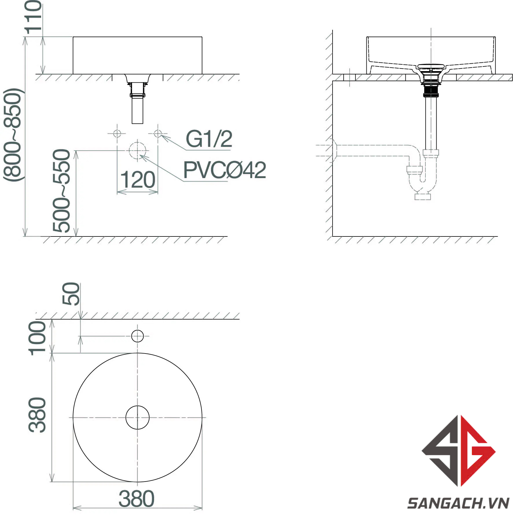 Bản vẽ kích thước lavabo CM02 Viglacera tròn: