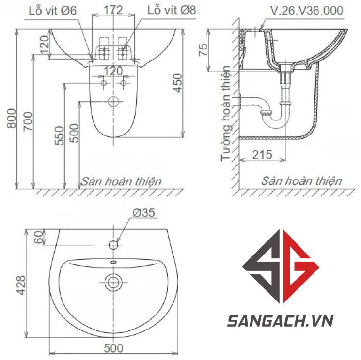Bản vẽ và hướng dẫn sử dụng của Chậu Rửa Lavabo Viglacera V36 Chân Treo: