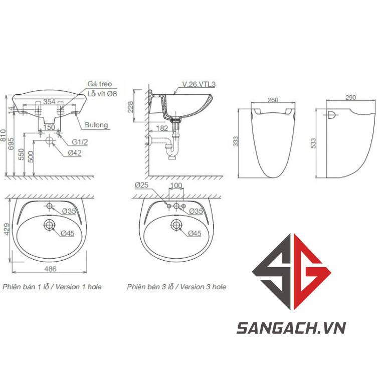Bản vẽ và hướng dẫn sử dụng của Chậu Rửa Lavabo Viglacera VTL3/VI5 Chân Treo: