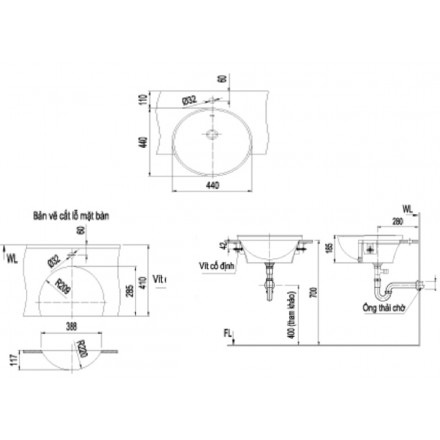 Bản vẽ kỹ thuật Chậu Rửa Mặt Lavabo INAX L-333V Bán Âm Tròn:
