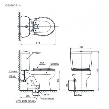 Bản vẽ kỹ thuật bàn cầu TOTO CS660DT1Y1 nắp TC392VS