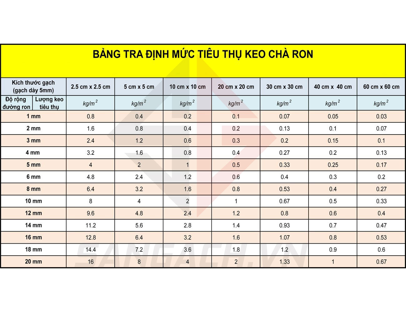 Bảng tính định mức tiêu thị keo chà ron thường gốc xi măng thông dụng hiện nay: