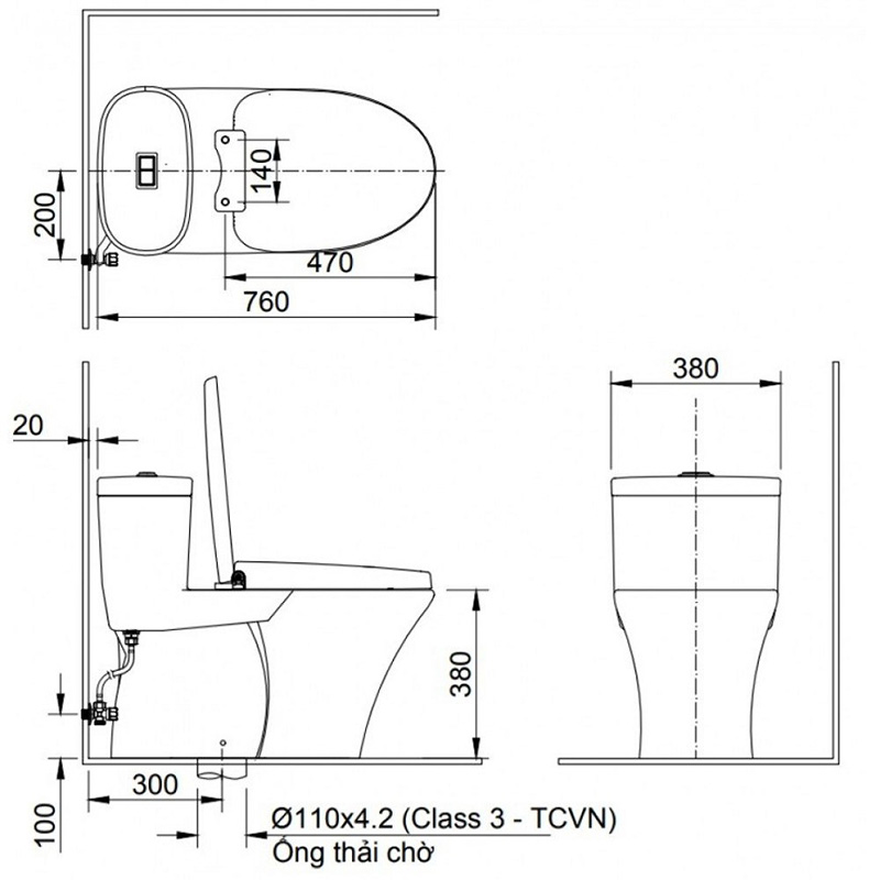 - Kích thước bồn cầu 1 khối 760x380x655 (Dài x Rộng x Cao)(mm)