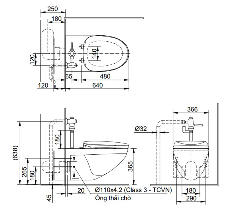 - Kích thước bồn cầu treo tường : 640 x 366 x 638 (Dài x Rộng x Cao)(mm)