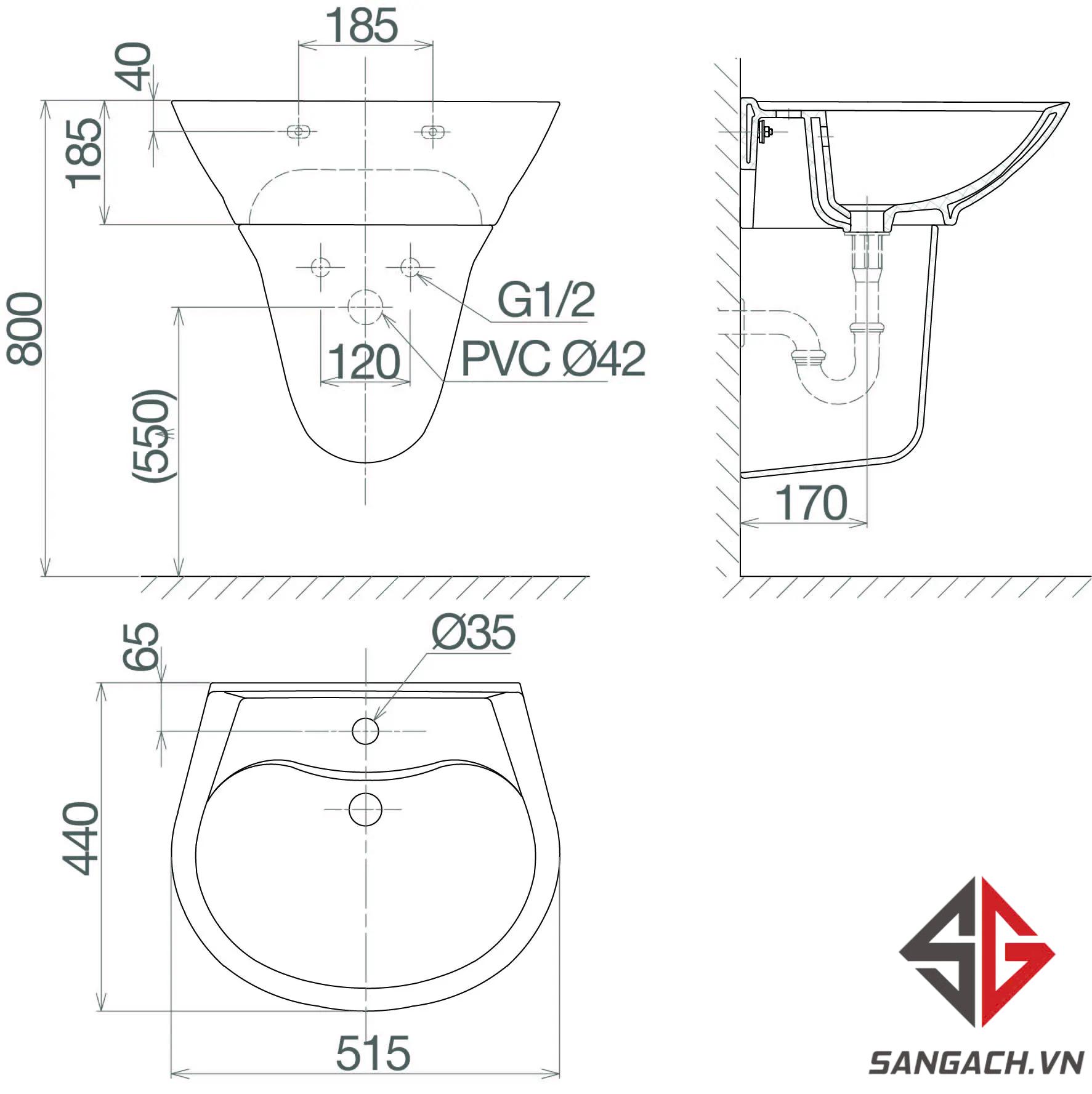Bản vẽ kích thước chậu rửa mặt V39 Viglacera treo tường: