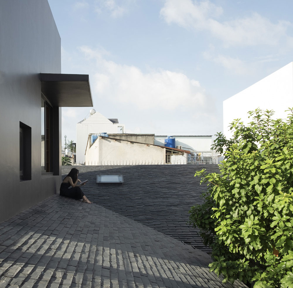 Sự tương phản được kết hợp tinh tế giữa kiến trúc khối hộp hiện đại và mái đá cổ.