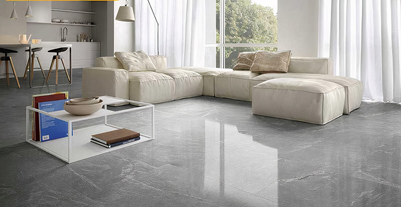 Không cần nội thất cầu kỳ, chính mẫu gạch bóng kính vân đá tự nhiên màu xám này đã tạo nên điểm nhấn độc đáo cho phòng khách