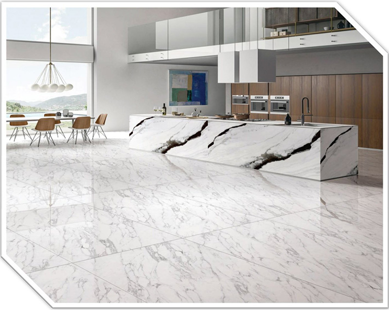 Phòng ăn rộng đẹp, sạch sẽ và tươi sáng với gạch bóng kính tone trắng chủ đạo, họa tiết vân đá đen