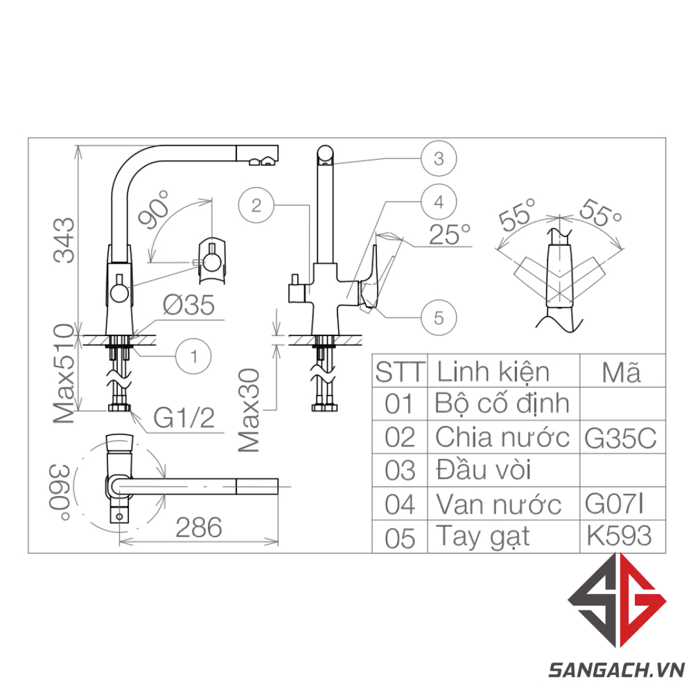 Bản vẽ kỹ thuật vòi bếp nóng lạnh Viglacera VG713: