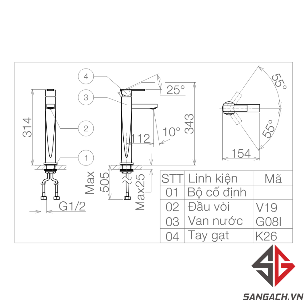 Bản vẽ kỹ thuật vòi lavabo thân cao VG126: