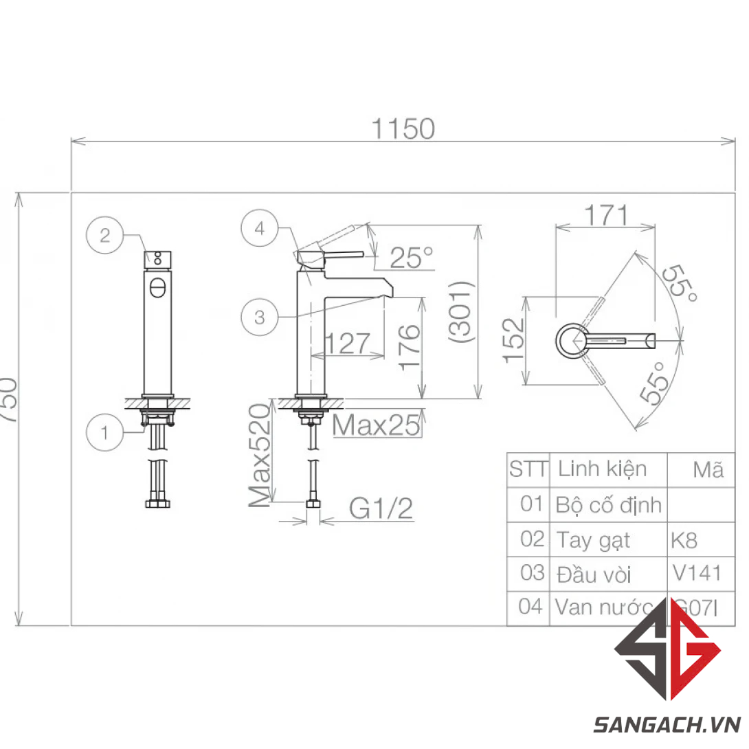 - File Bản vẽ Spec Vòi Chậu Rửa Mặt Lavabo Viglacera VG141.1 Nóng Lạnh Cổ Cao