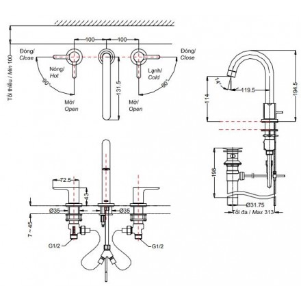 Bản Vẽ Kỹ Thuật Vòi Lavabo TOTO TLS01201B 3 Lỗ: